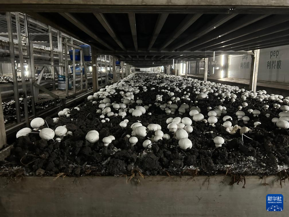 临泽现代寒旱农业产业园双孢菇工厂化生产菇房里的双孢菇。新华社记者 宋佳 摄