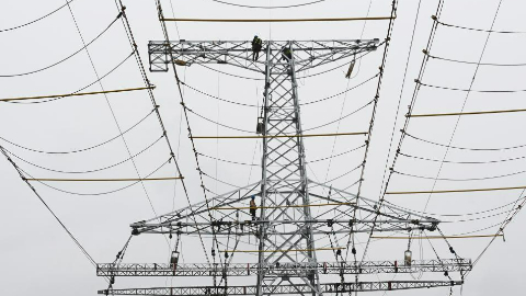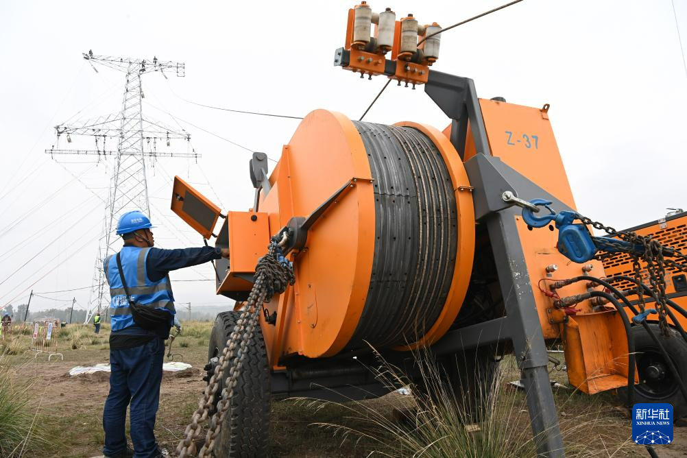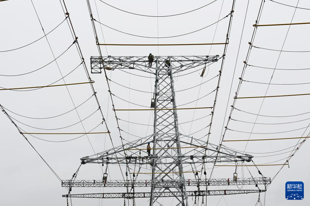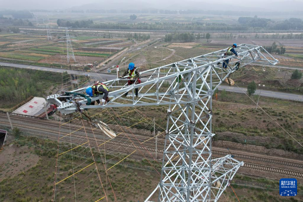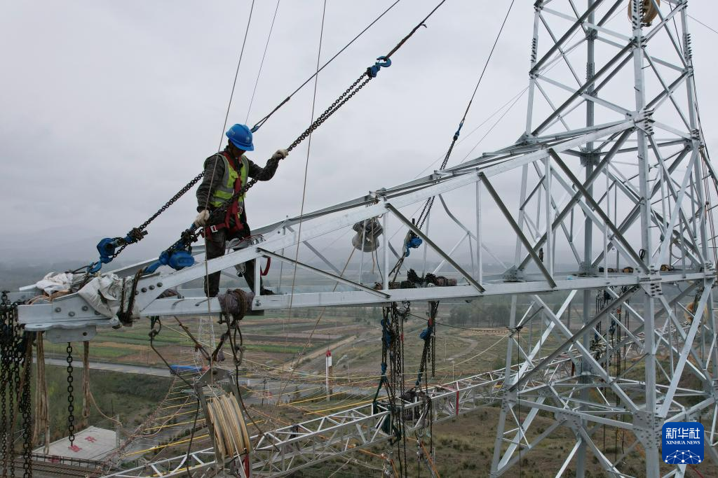 9月8日,工人在武威市天祝县境内的兰新(张)三四线甘肃牵引站330千伏外部供电工程施工现场作业。新华社记者 范培珅 摄