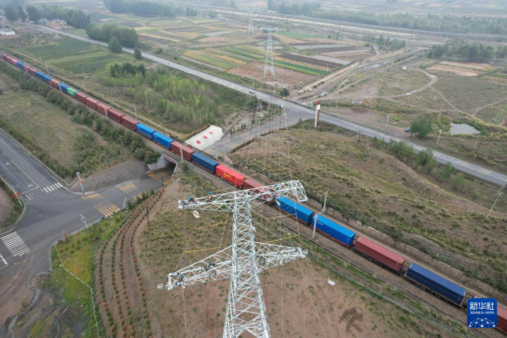这是9月8日在武威市天祝县境内拍摄的兰新(张)三四线甘肃牵引站330千伏外部供电工程施工现场(无人机照片)。新华社记者 范培珅 摄