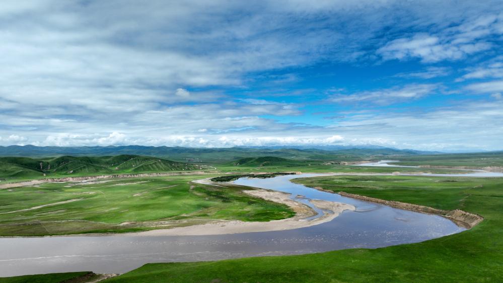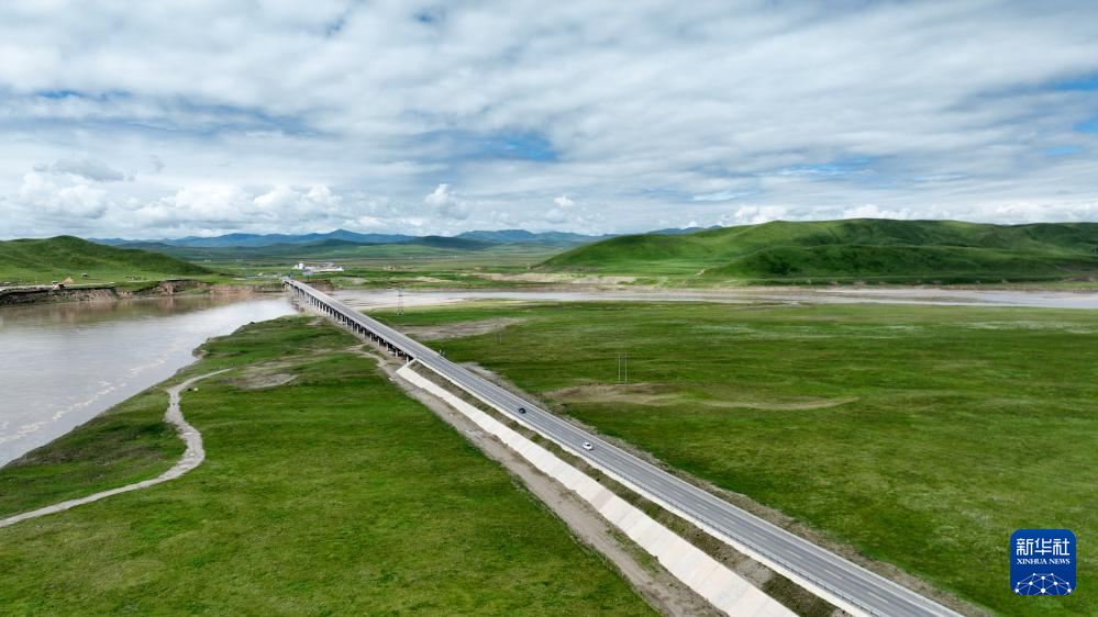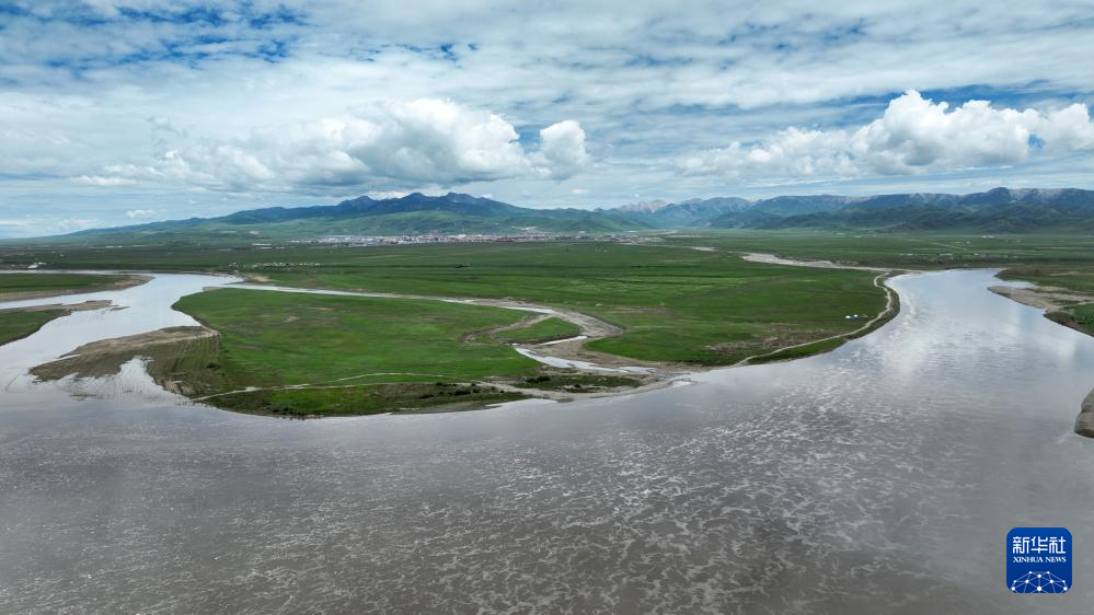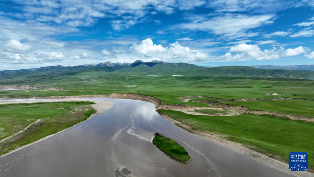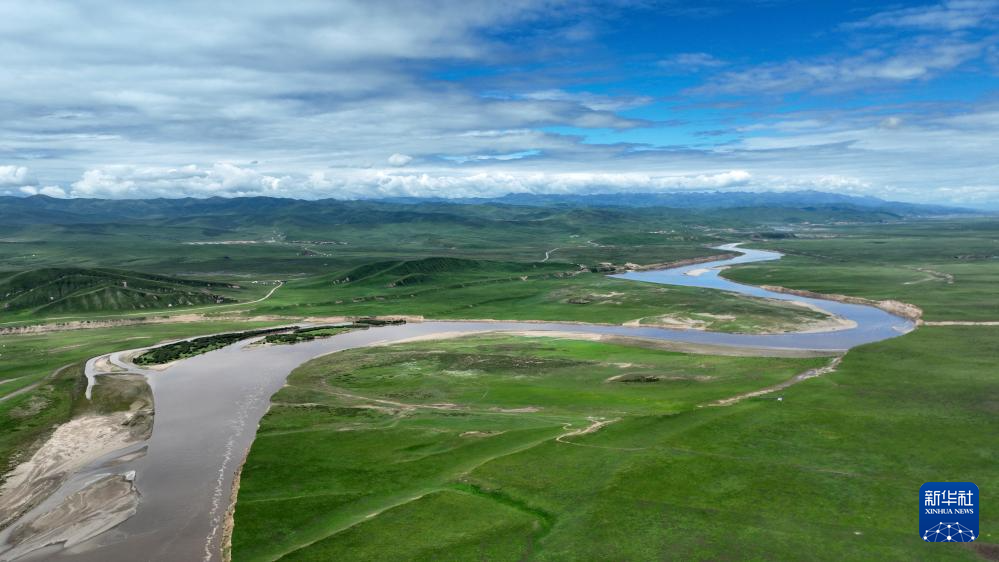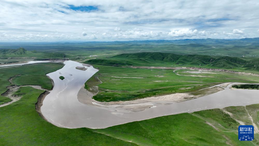 玛曲县黄河两岸绿意盎然(7月6日摄,无人机照片)。新华社记者 张可任 摄