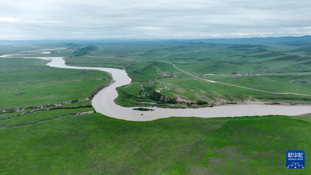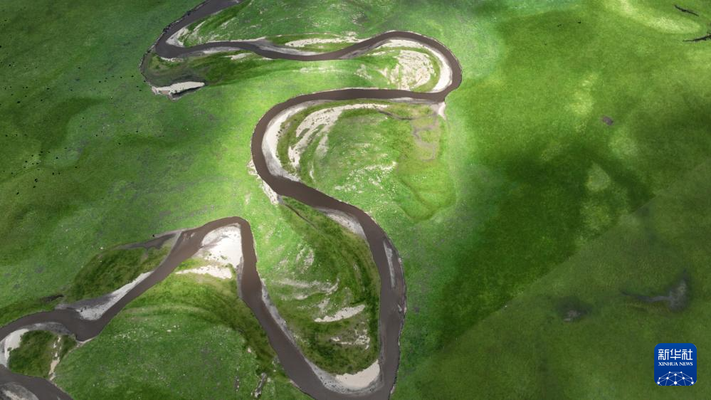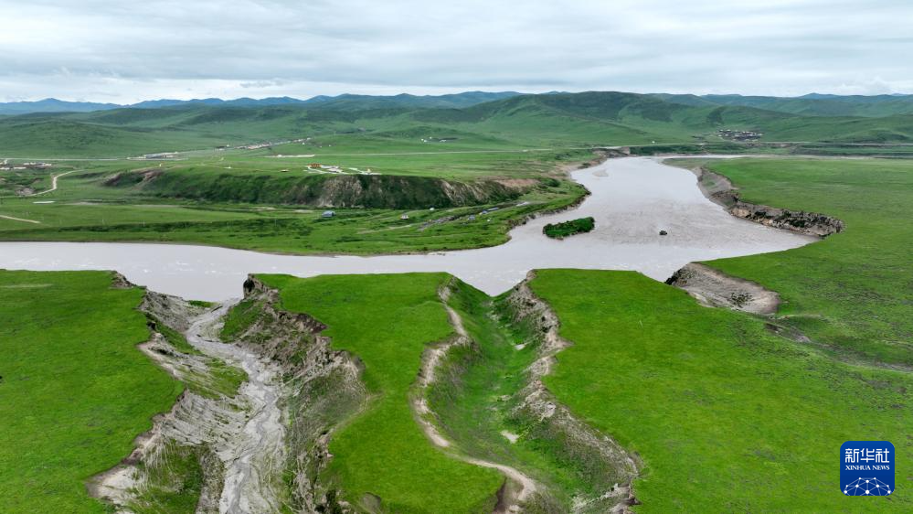 这是玛曲县城外黄河沿岸一处经过治理修复的草场(7月6日摄,无人机照片)。新华社记者 陈斌 摄
