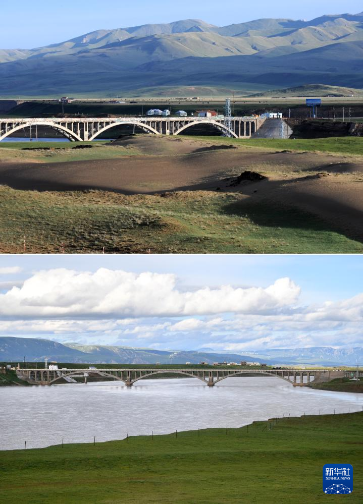拼版照片:上图为2011年6月10日在甘南藏族自治州玛曲县城郊的黄河大桥附近拍摄的大面积沙化退化草场(新华社记者聂建江摄);下图为2023年7月6日在甘南藏族自治州玛曲县城郊的黄河大桥附近拍摄的沙化退化草场已经复绿(新华社记者陈斌摄)。新华社发