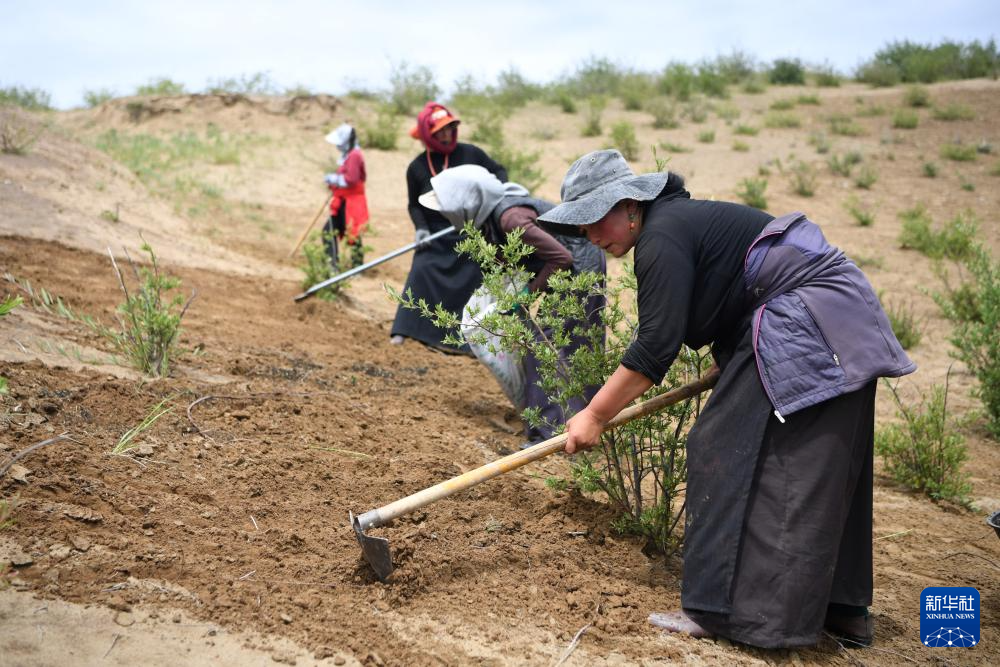 牧民在玛曲县欧拉镇黄河沿岸一处沙化草原治理点补种草籽(7月6日摄)。新华社记者 方欣 摄