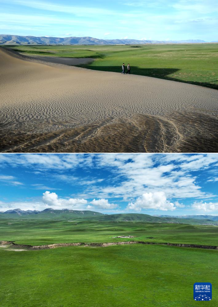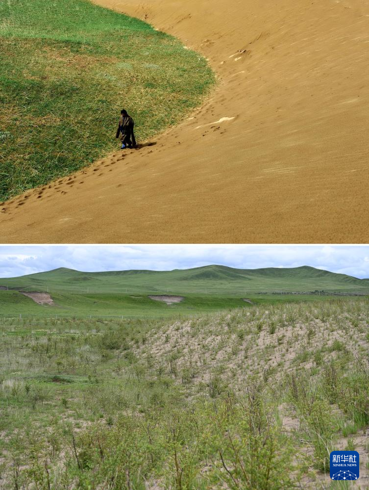 拼版照片:上图为2011年6月9日,甘南藏族自治州玛曲县欧拉乡欧强村村民豆格甲走在被沙丘侵入的草场上(新华社记者聂建江 摄);下图为2023年7月6日在甘南藏族自治州玛曲县欧拉镇欧强村拍摄的一处完成沙化治理的草场(新华社记者陈斌摄)。新华社发