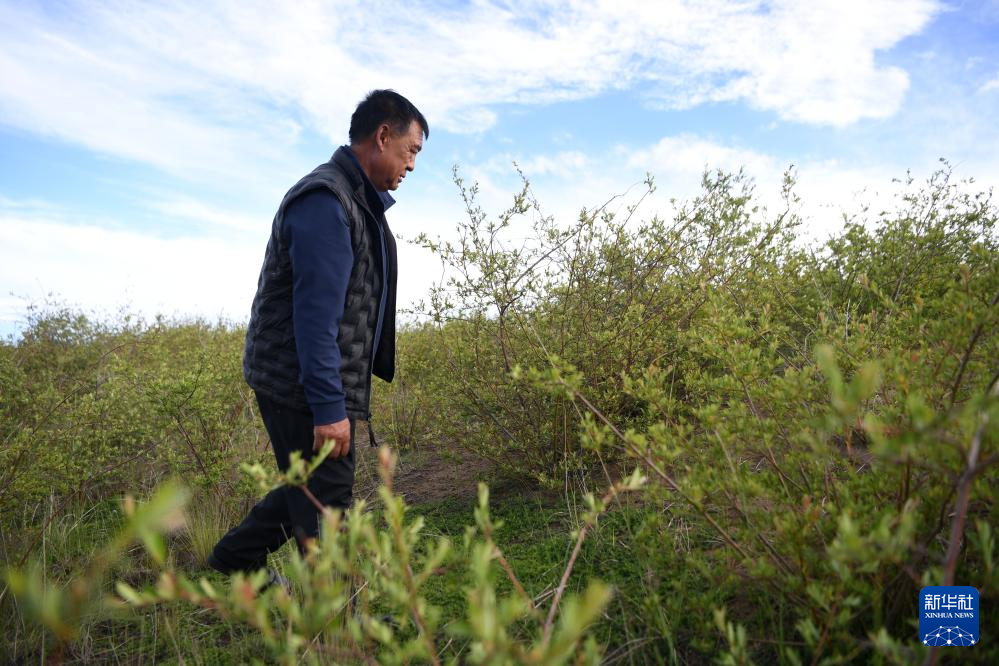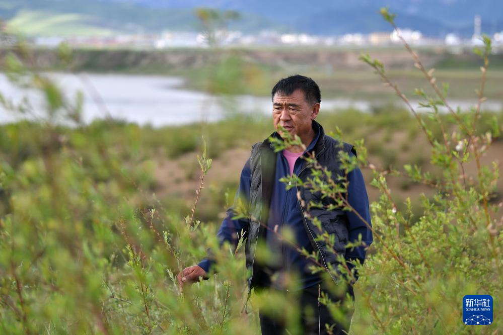 多年投身沙化草原治理的牧民卓玛加布在黄河玛曲段干流沿岸一处沙化草原治理点查看他参与种植的植被生长情况(7月5日摄)。新华社记者 陈斌 摄
