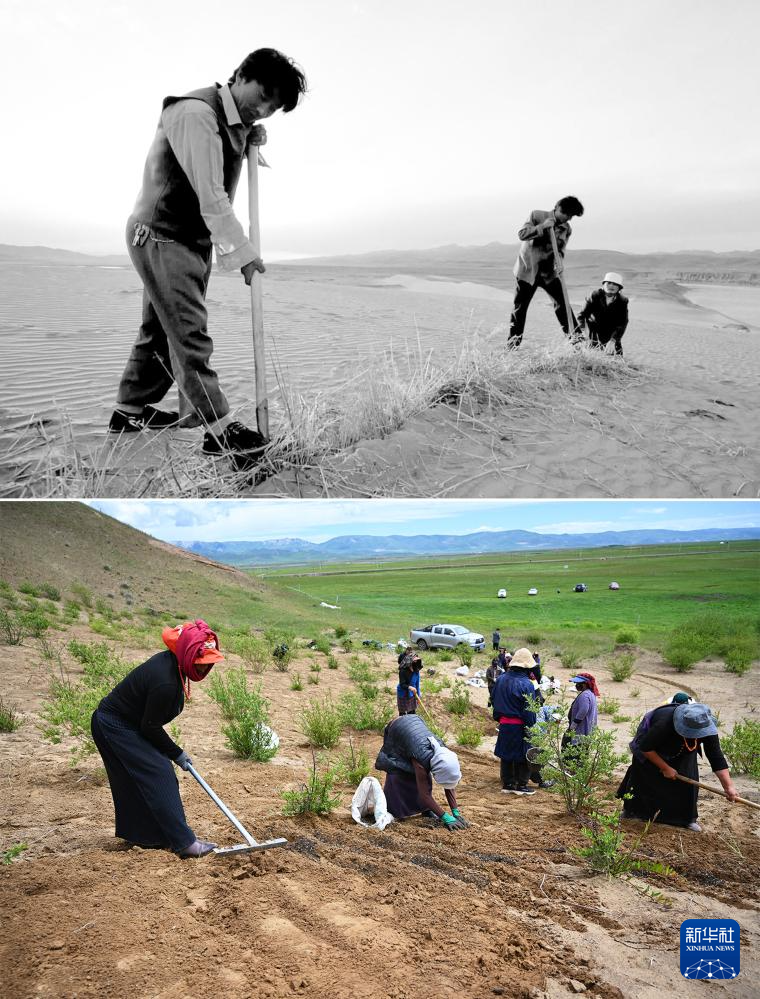 拼版照片:上图为2002年参与防治沙漠化的工作人员在玛曲县黄河沿岸一处沙化草场上压沙(新华社记者韩传号摄);下图为2023年7月6日,牧民在玛曲县黄河沿岸一处沙化草原治理点进行草籽补种工作(新华社记者张可任摄)。新华社发