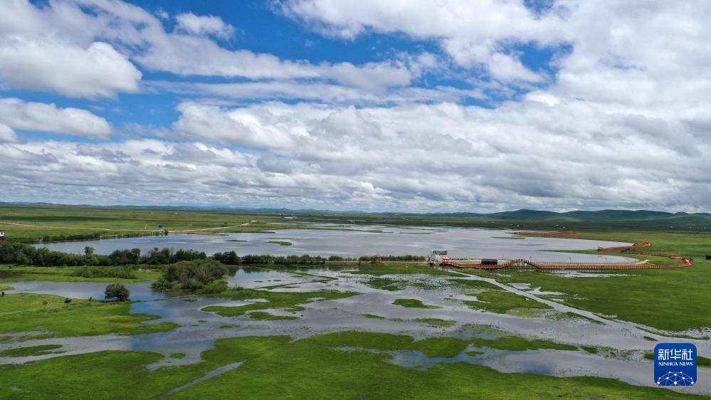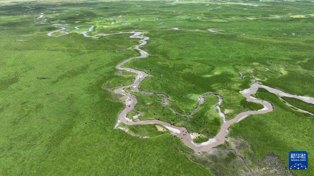 这是玛曲县河曲马场的湿地草原景色(7月5日摄,无人机照片)。新华社记者 张可任 摄