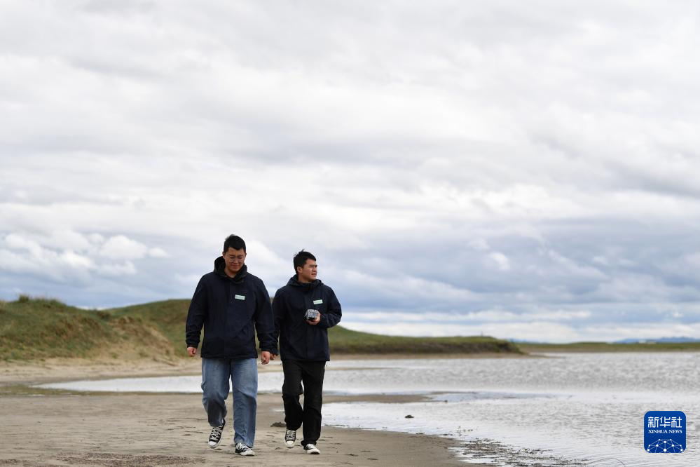 在甘南藏族自治州玛曲县,甘肃黄河首曲国家级自然保护区管护中心曼日玛保护站工作人员王佳阳(左)和同事在保护区内巡护(7月5日摄)。新华社记者 方欣 摄