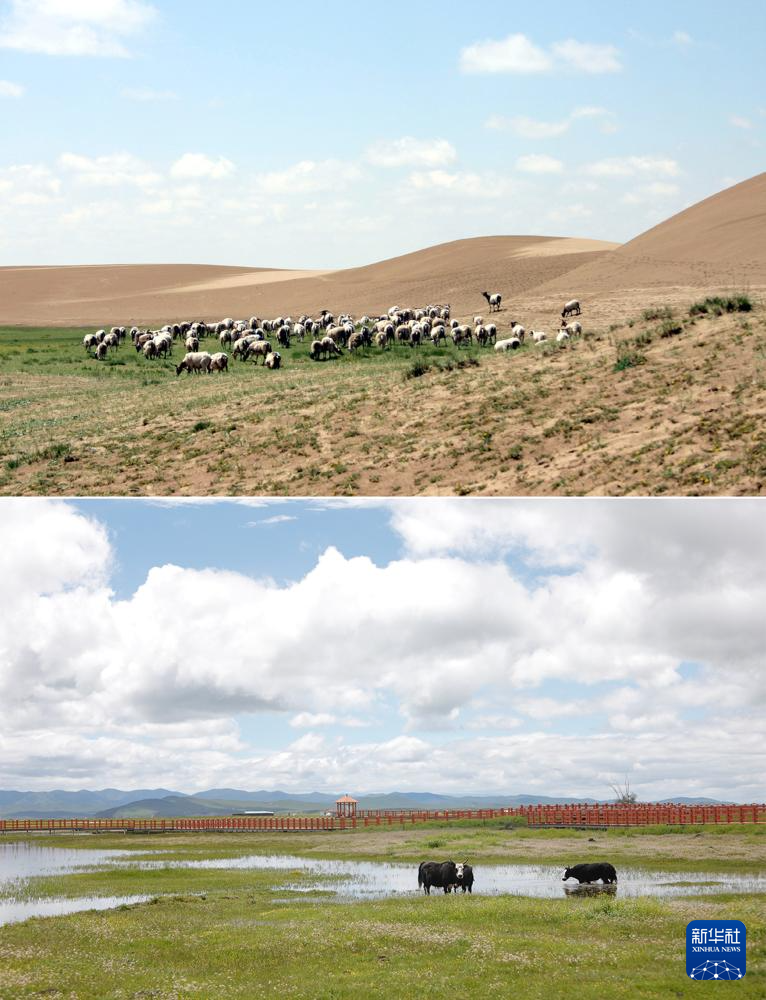 拼版照片:上图为2004年7月19日,羊群在玛曲县一处沙化退化的草场上吃草,背后是大片流动沙丘(新华社记者宋常青摄);下图为2023年7月5日牦牛在玛曲县湿地草原上吃草(无人机照片,新华社记者陈斌摄)。新华社发