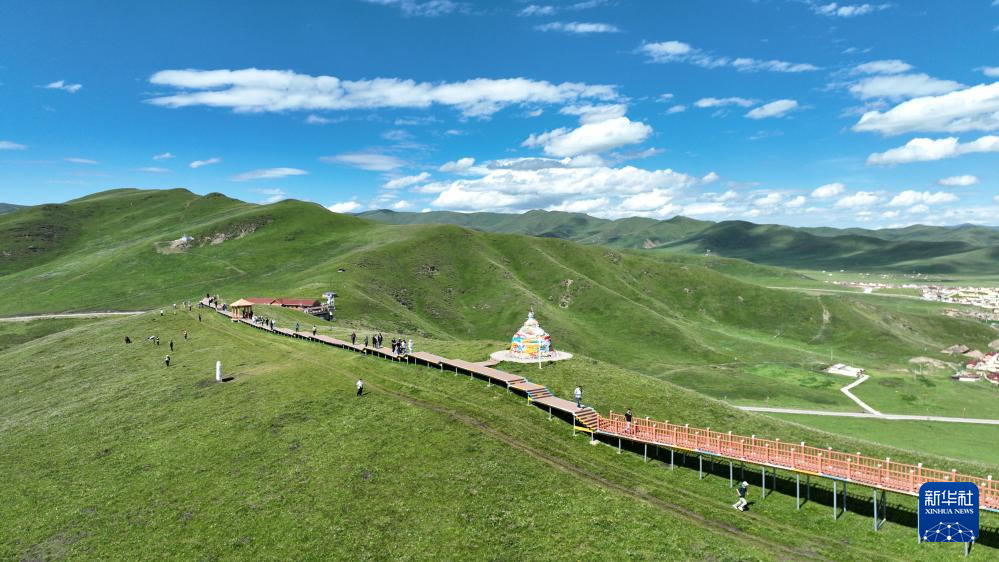 游客在甘南藏族自治州玛曲县阿万仓湿地的观景步道上游览(7月6日摄,无人机照片)。新华社记者 陈斌 摄