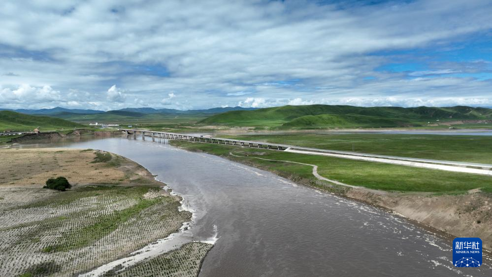 这是玛曲县城外黄河岸边一处经过治理修复的草场,已种植上牧草和灌木(7月6日摄,无人机照片)。新华社记者 张可任 摄