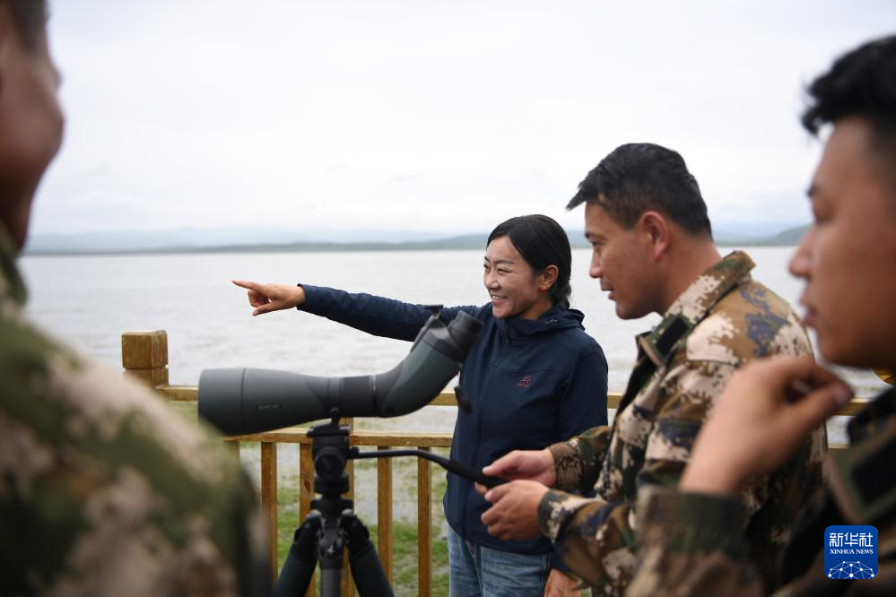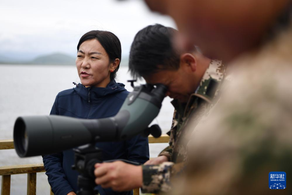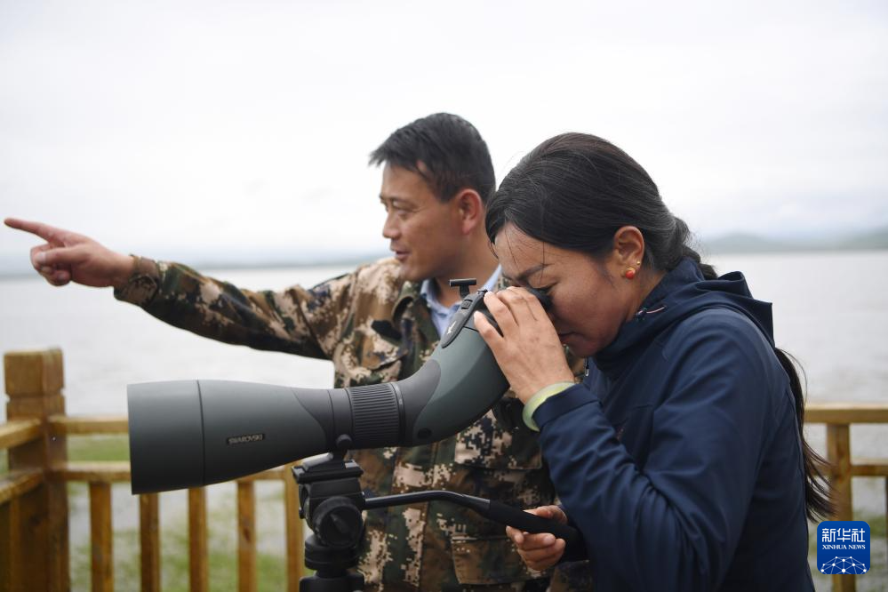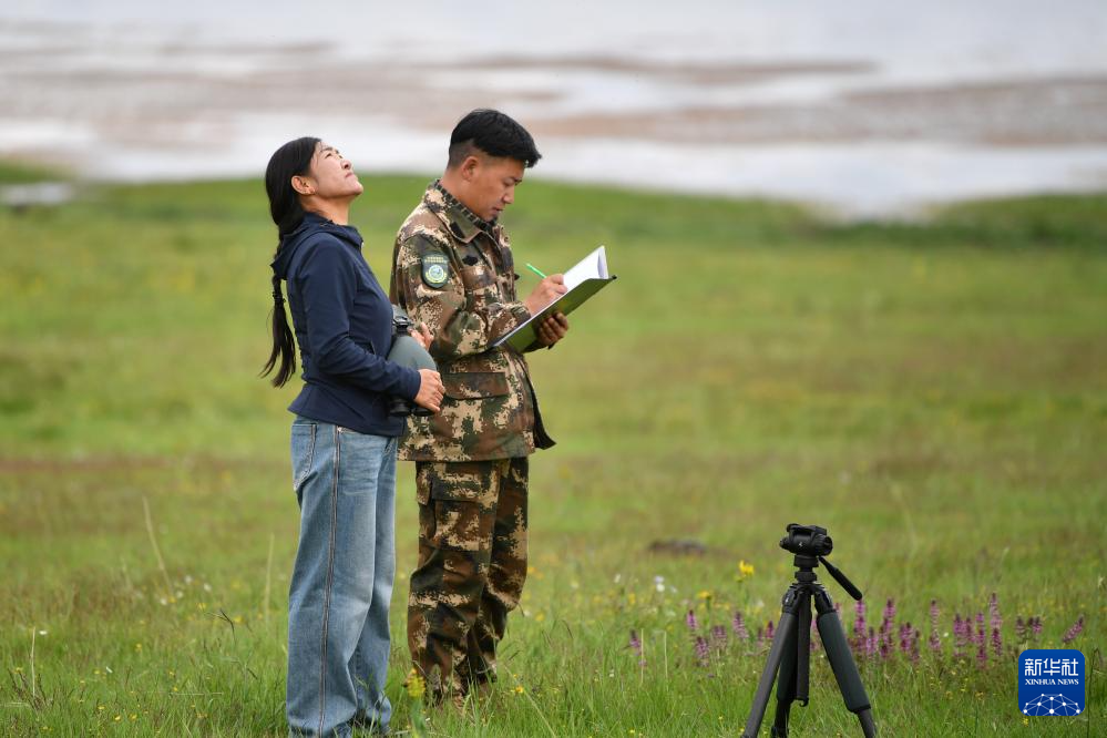 甘肃尕海则岔国家级自然保护区管护中心尕海保护站站长香毛吉(左一)和同事在保护区内用望远镜观测野生动物(7月7日摄)。新华社记者 陈斌 摄