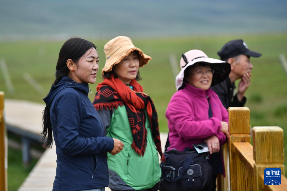 甘肃尕海则岔国家级自然保护区管护中心尕海保护站站长香毛吉(左一)向游客介绍保护区的野生动植物情况(7月7日摄)。新华社记者 陈斌 摄
