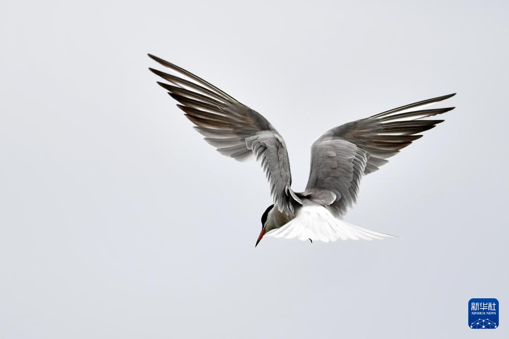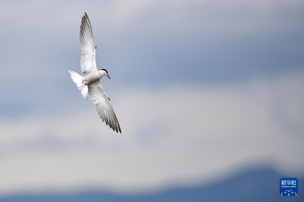 一只燕鸥在甘肃尕海则岔国家级自然保护区的尕海湿地上飞翔(7月7日摄)。新华社记者 陈斌 摄