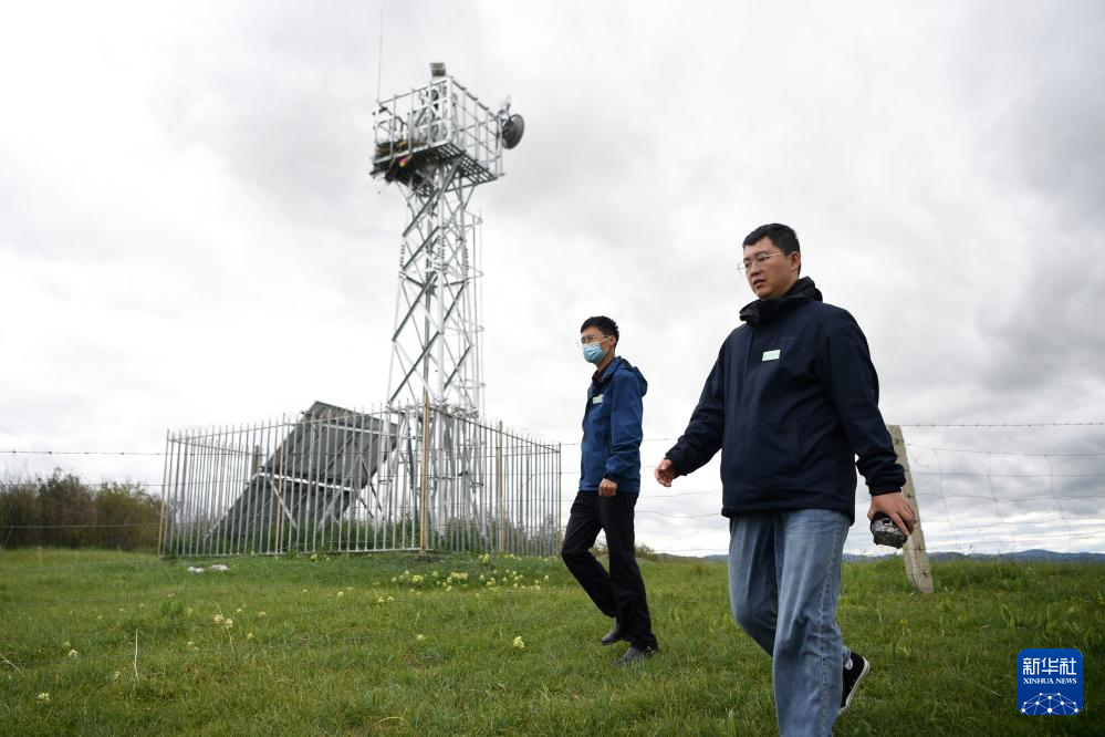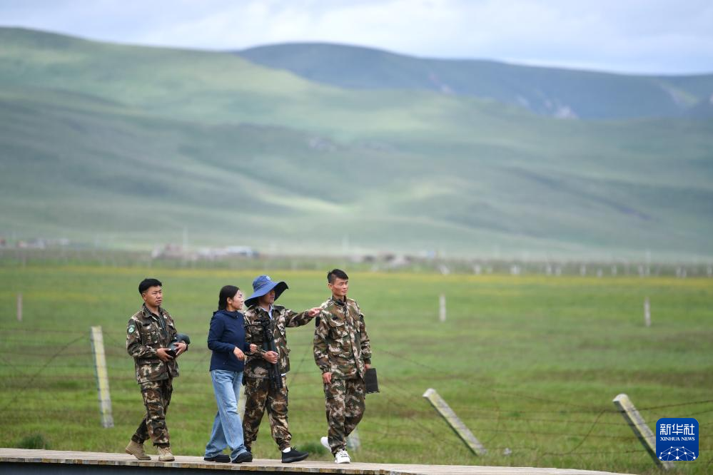 甘肃黄河首曲国家级自然保护区管护中心曼日玛保护站工作人员王佳阳(右)和同事在保护区内巡护(7月5日摄)。新华社记者 陈斌 摄