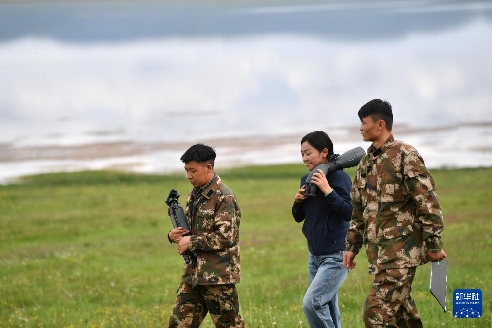 甘肃尕海则岔国家级自然保护区管护中心尕海保护站站长香毛吉(左二)和同事在保护区内巡护(7月7日摄)。新华社记者 陈斌 摄