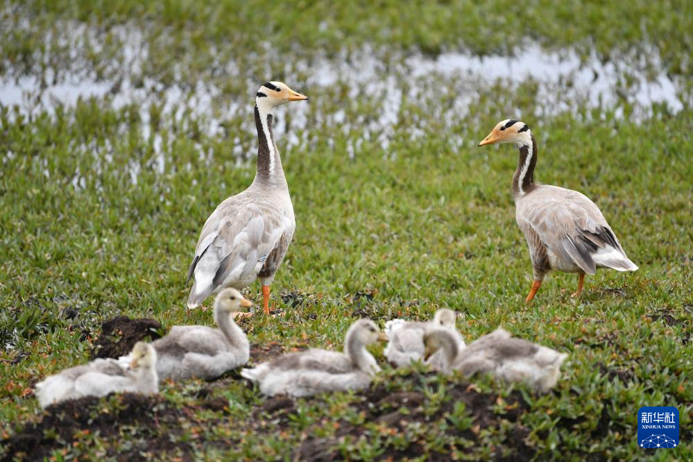 这是在甘肃尕海则岔国家级自然保护区的尕海湿地上拍摄的斑头雁(7月7日摄)。新华社记者 张可任 摄