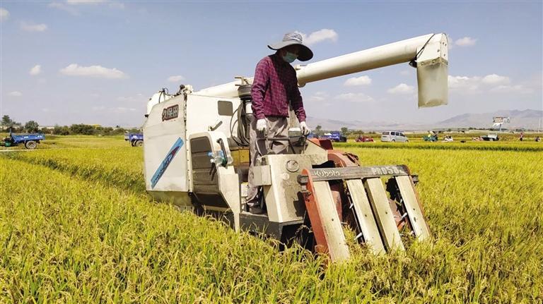 稻谷黄,秋收忙。连日来,在靖远县三滩、东湾等乡镇各村金灿灿的稻田里,收割机开足马力往返穿梭,一粒粒稻米鼓起了农民腰包。