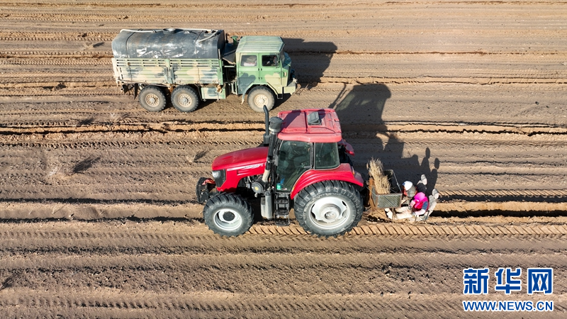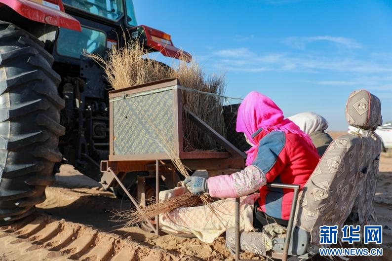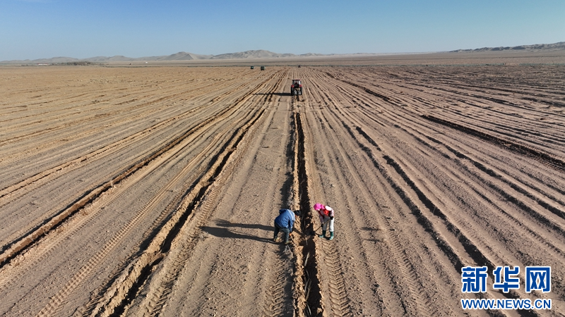 近日,在甘肃省酒泉市金塔县红墩子公益林项目绿化工程建设现场,工人正在用大型机械种植梭梭。