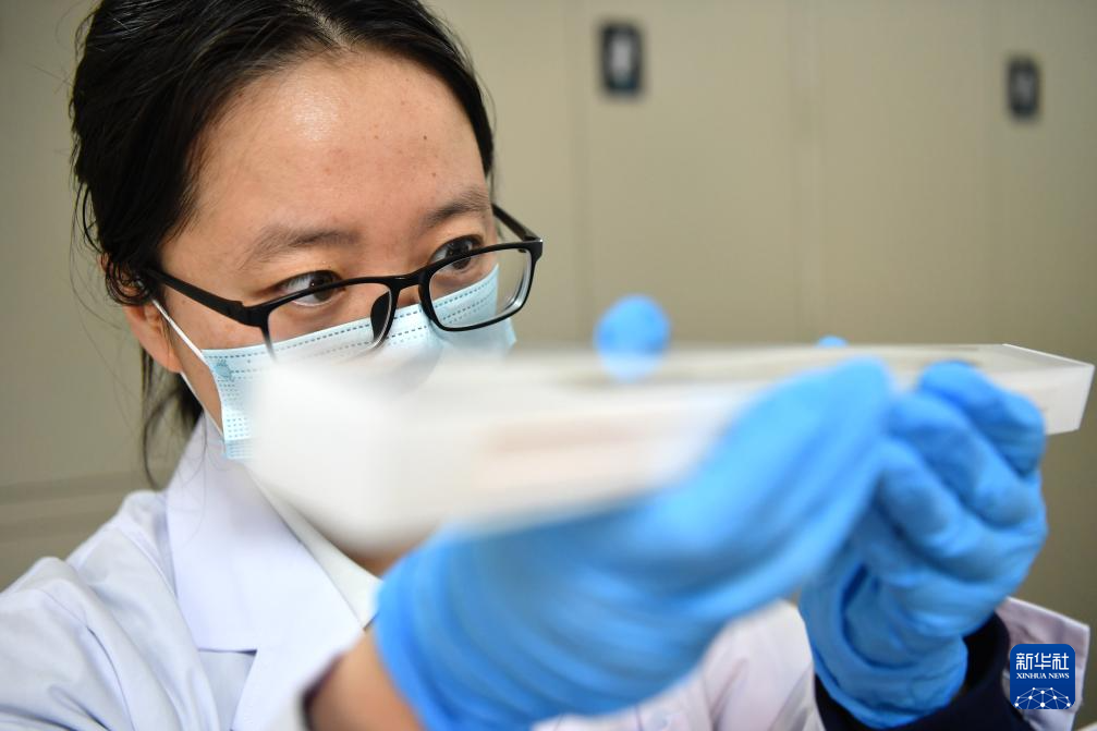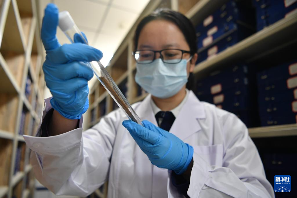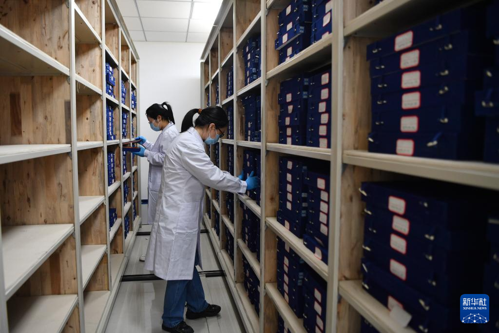 甘肃简牍博物馆科技保护部文物库房管理员杨升查看简牍的封装保护情况(10月26日摄)。新华社记者 陈斌 摄
