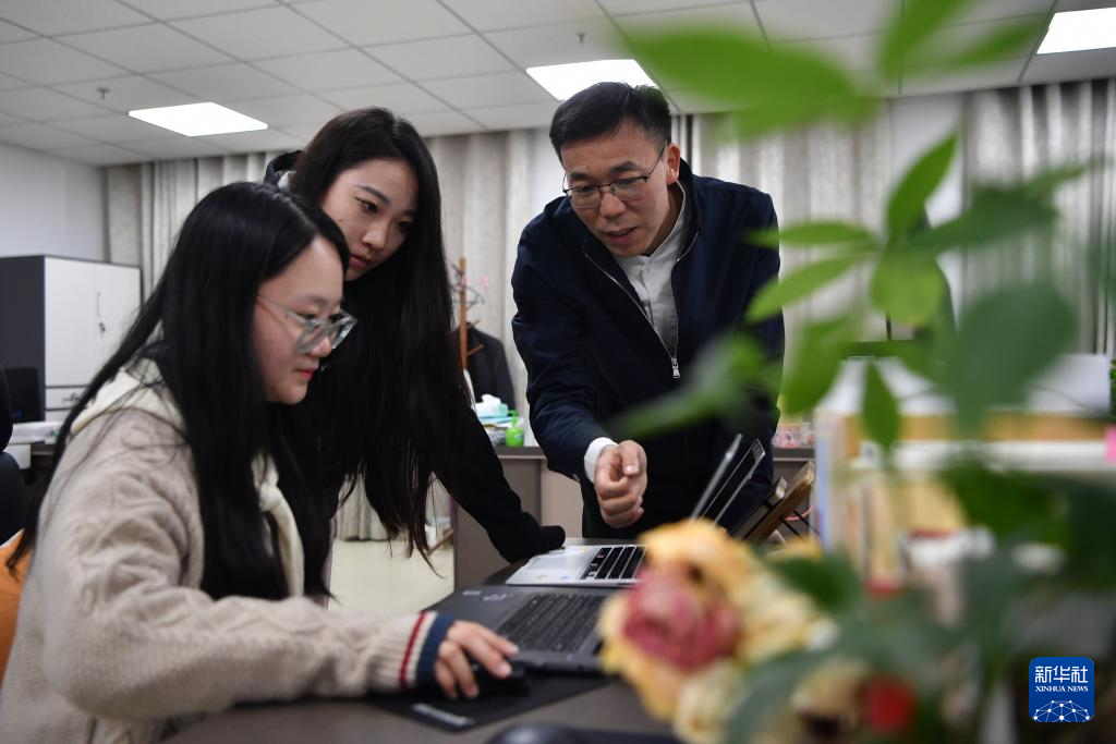 甘肃简牍博物馆整理研究部主任肖从礼(右一)和同事交流简牍数字化工作(10月25日摄)。新华社记者 陈斌 摄