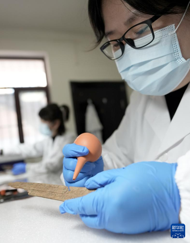 甘肃文博服务中心文物修复师李媛在清理简牍上灰尘(10月26日摄)。新华社记者 王毓国 摄