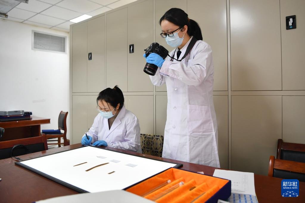 甘肃简牍博物馆科技保护部文物库房管理员杨升(右)和同事常晓丽在整理登记简牍信息(10月26日摄)。新华社记者 陈斌 摄