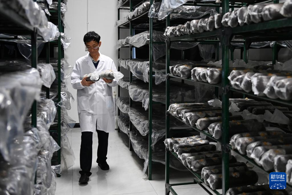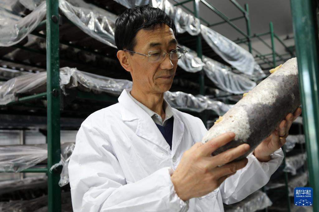 11月29日,在后官寨镇司官寨村食用菌基地,工作人员查看新培育的菌种。新华社记者 范培珅 摄