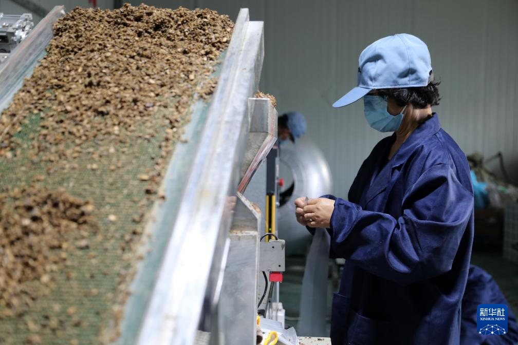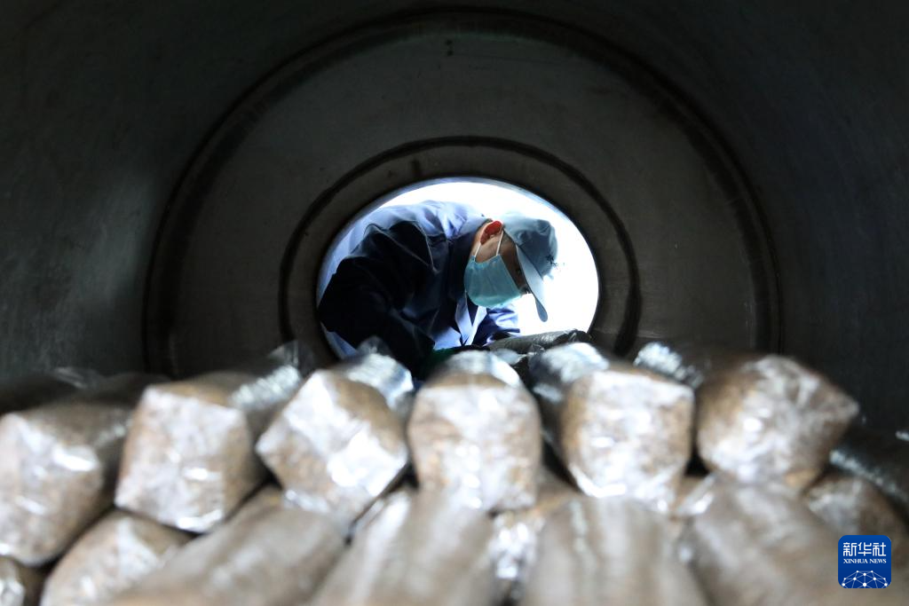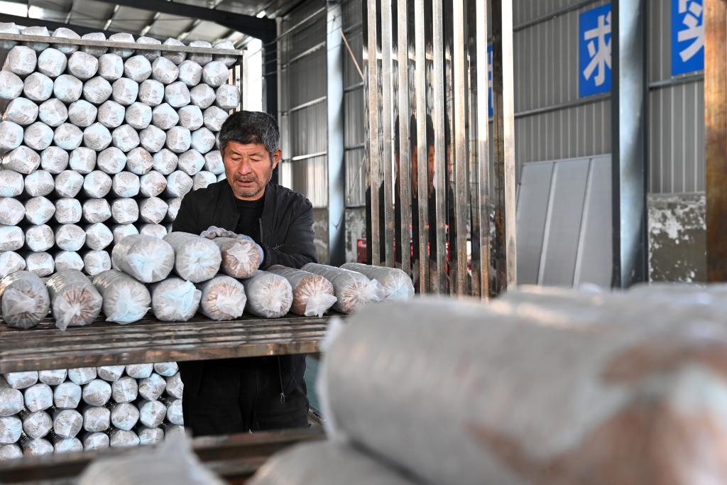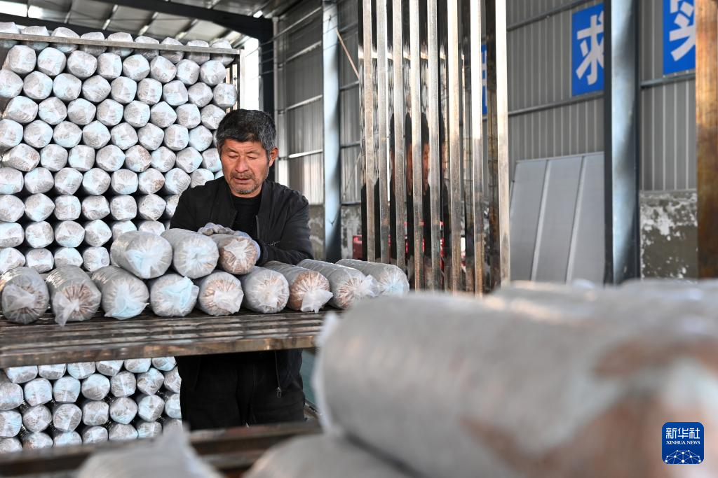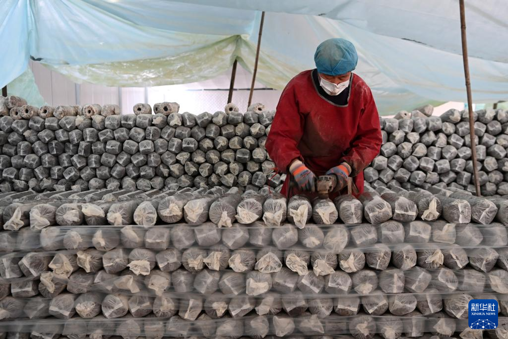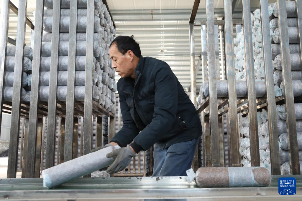 11月29日,在后官寨镇司官寨村食用菌基地,工作人员查看菌种原料。新华社记者 范培珅 摄