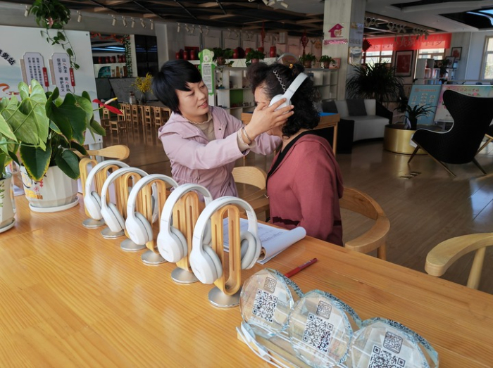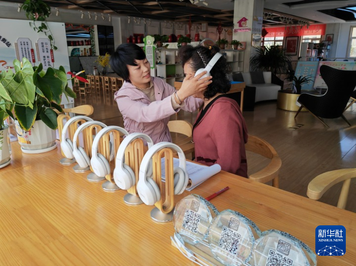 在静宁县崇文路社区党群服务中心的有声书吧,工作人员正为居民调试耳机。新华社记者王紫轩 摄