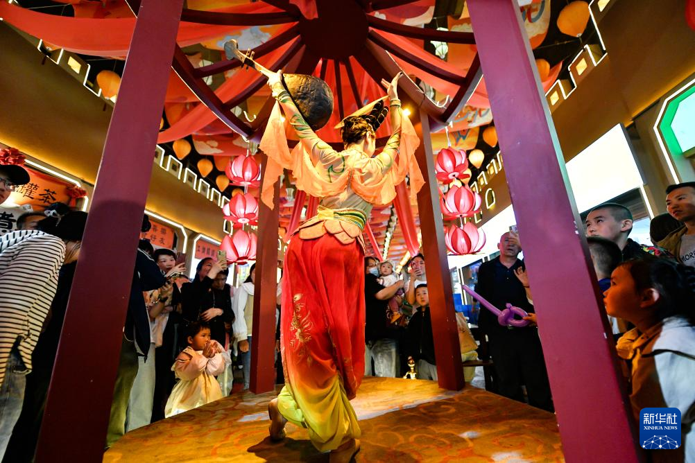 4月26日,在位于兰州市城关区的黄河食渡文旅美食街,游客观看文艺表演。新华社记者 郎兵兵 摄