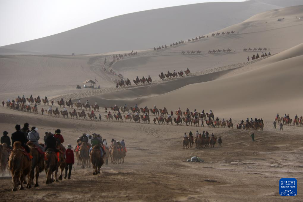 5月4日,游客在甘肃省敦煌市鸣沙山月牙泉景区游览。新华社发(张晓亮 摄)