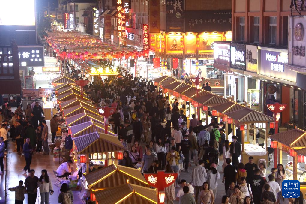 5月3日晚,游客在甘肃省敦煌市游览夜市。新华社发(张晓亮 摄)