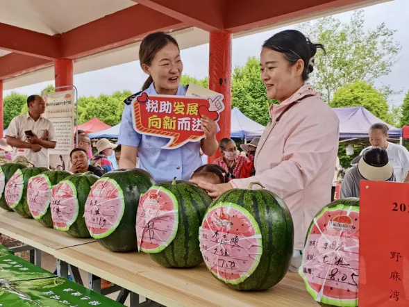 瓜农向税务干部展示今年丰收的野麻湾西瓜