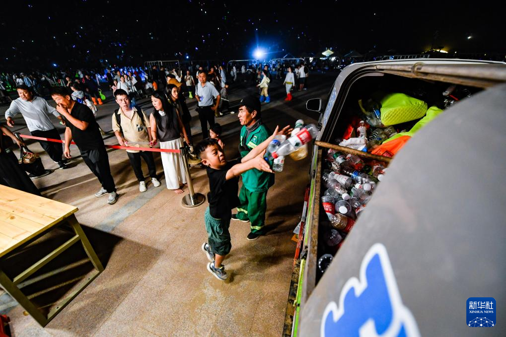 7月20日晚,在敦煌鸣沙山月牙泉景区的沙漠万人星空演唱会现场,游客将垃圾丢进垃圾转运车。新华社记者 郎兵兵 摄