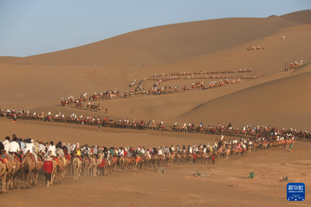 7月20日傍晚,游客在敦煌鸣沙山月牙泉景区骑骆驼。新华社发(张晓亮 摄)