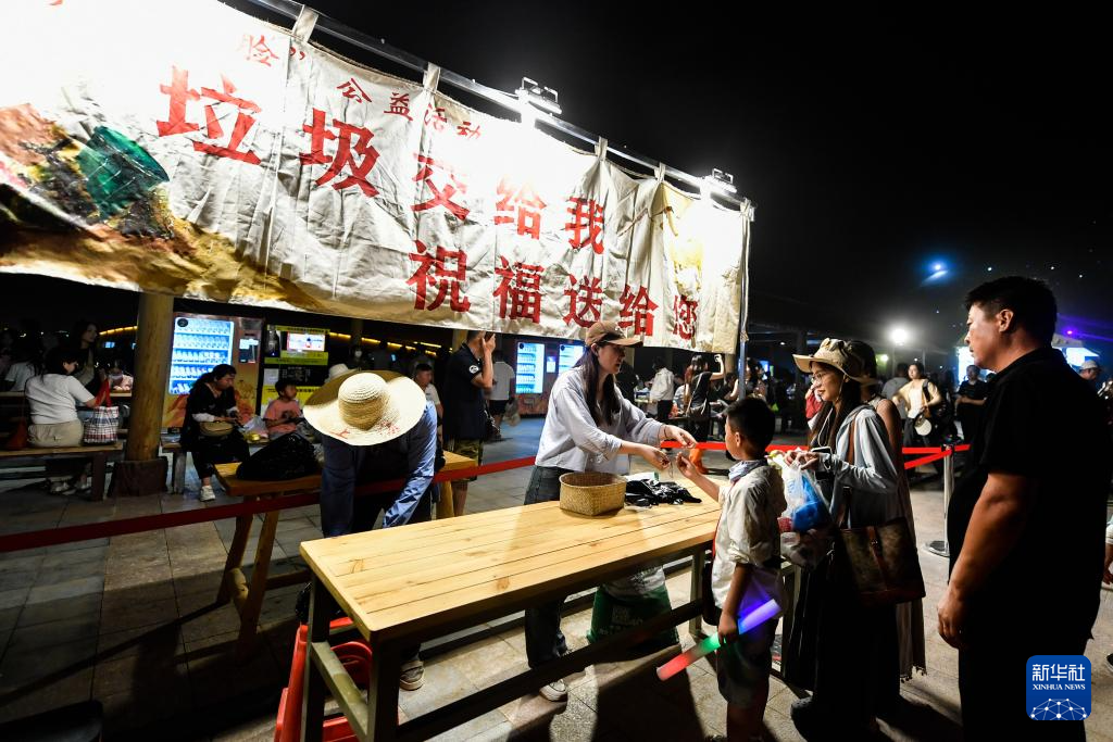 7月20日晚,在敦煌鸣沙山月牙泉景区的沙漠万人星空演唱会现场,游客拎着垃圾向景区工作人员兑换小礼品。新华社记者 郎兵兵 摄
