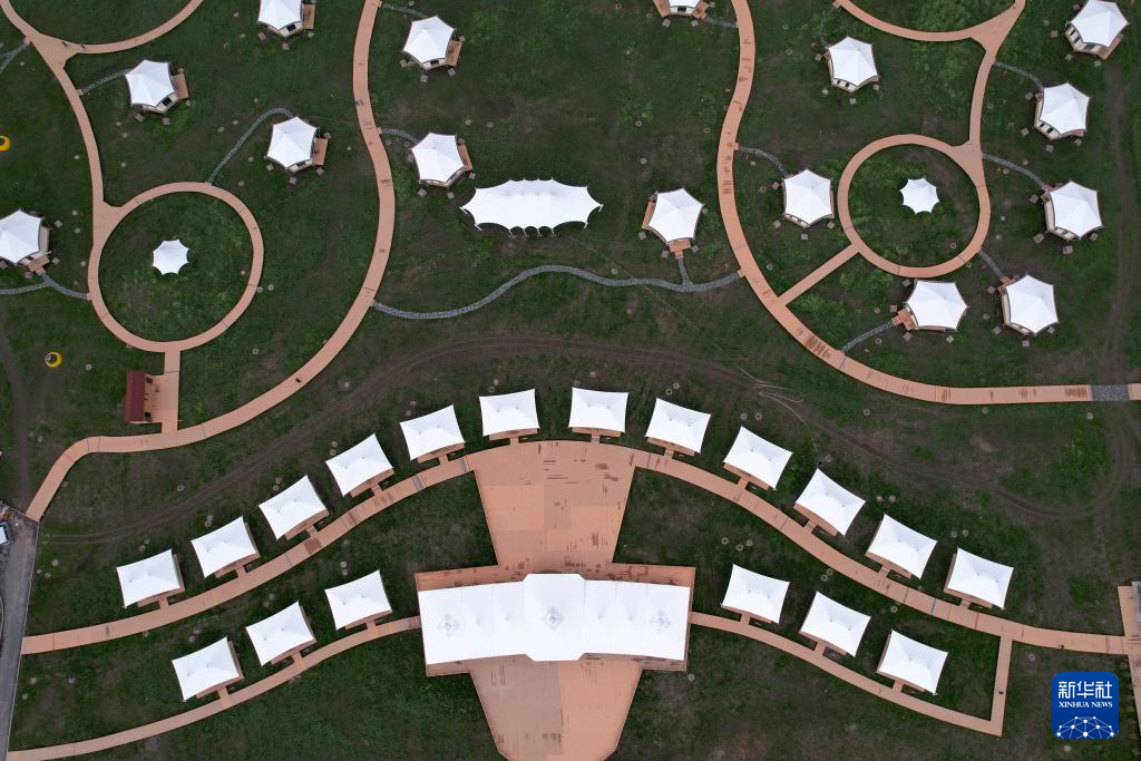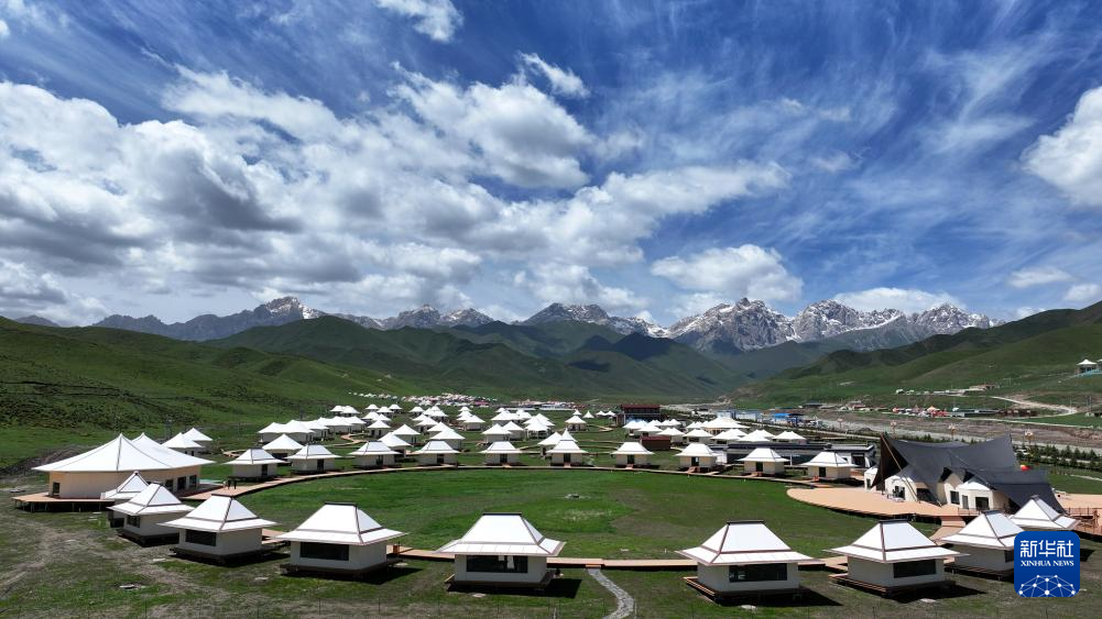 6月21日拍摄的抓喜秀龙草原帐篷城,远处为马牙雪山(无人机照片)。新华社发(拜占龙摄)