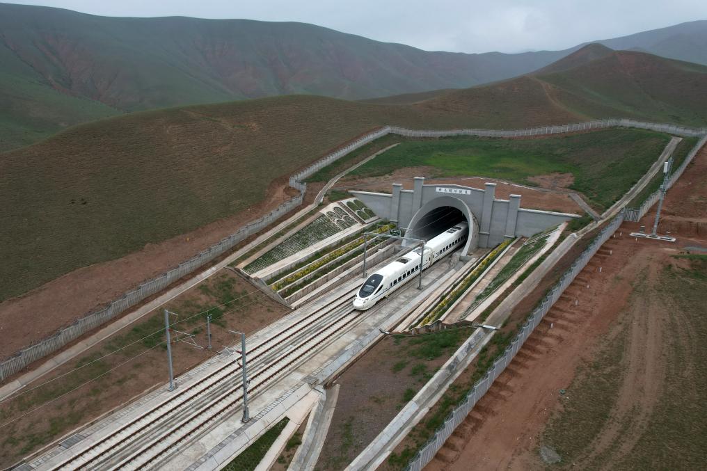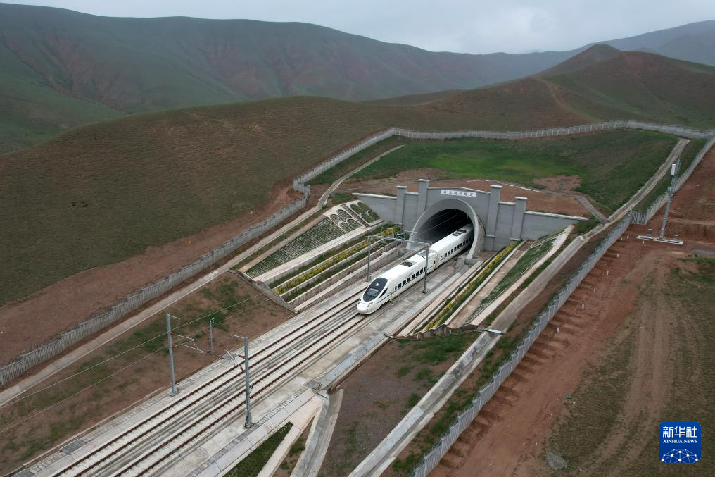 7月8日,在兰张高铁兰武段,列车驶出新乌鞘岭隧道(无人机照片)。新华社记者 范培珅 摄