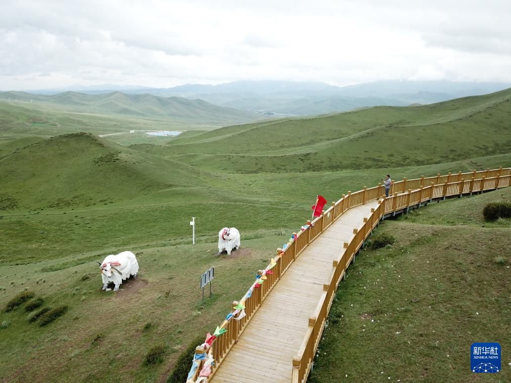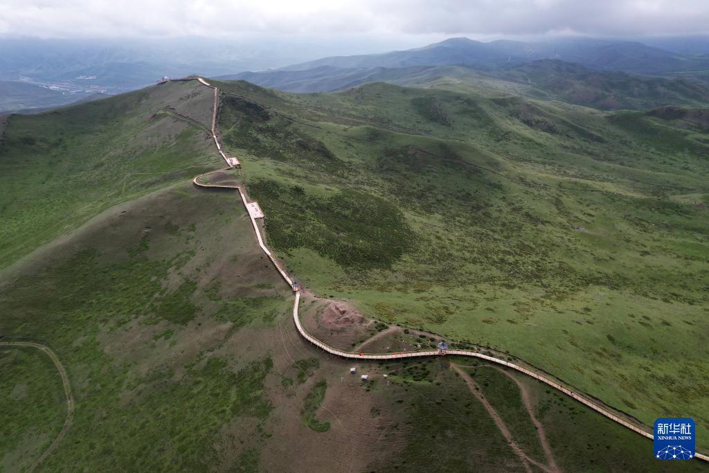 7月8日,游客在乌鞘岭上的木栈道上游览赏景(无人机照片)。新华社记者 马宁 摄