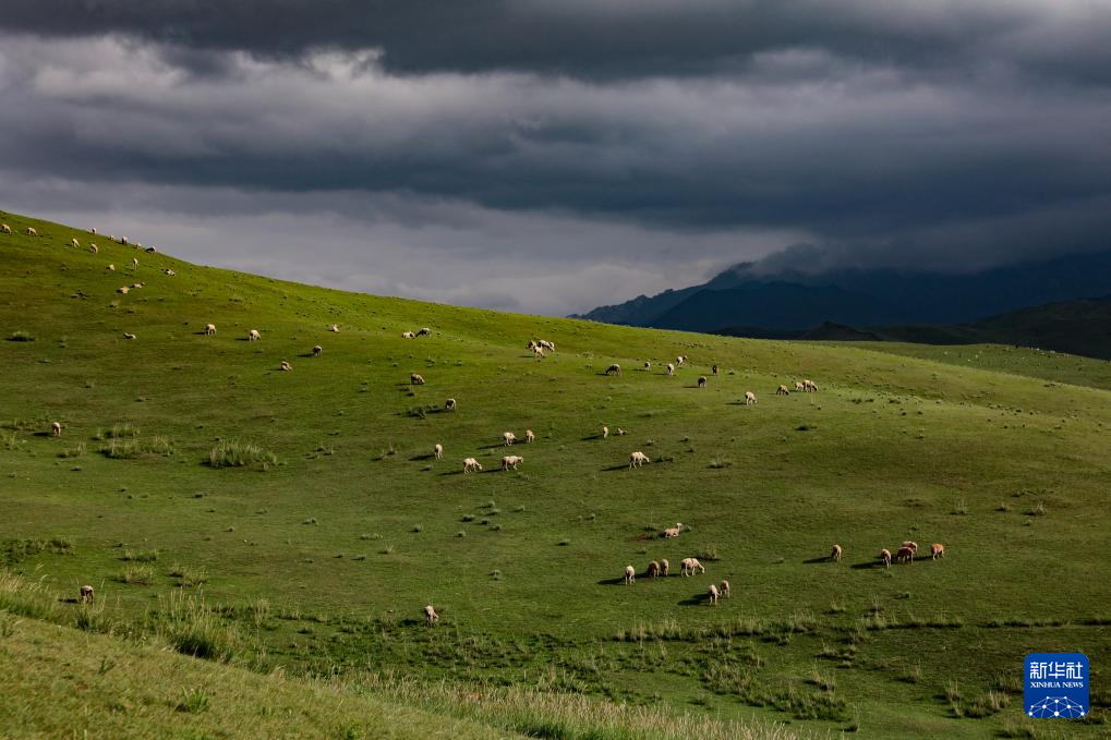 7月8日,羊群在乌鞘岭下的草场上觅食。新华社记者 郎兵兵 摄
