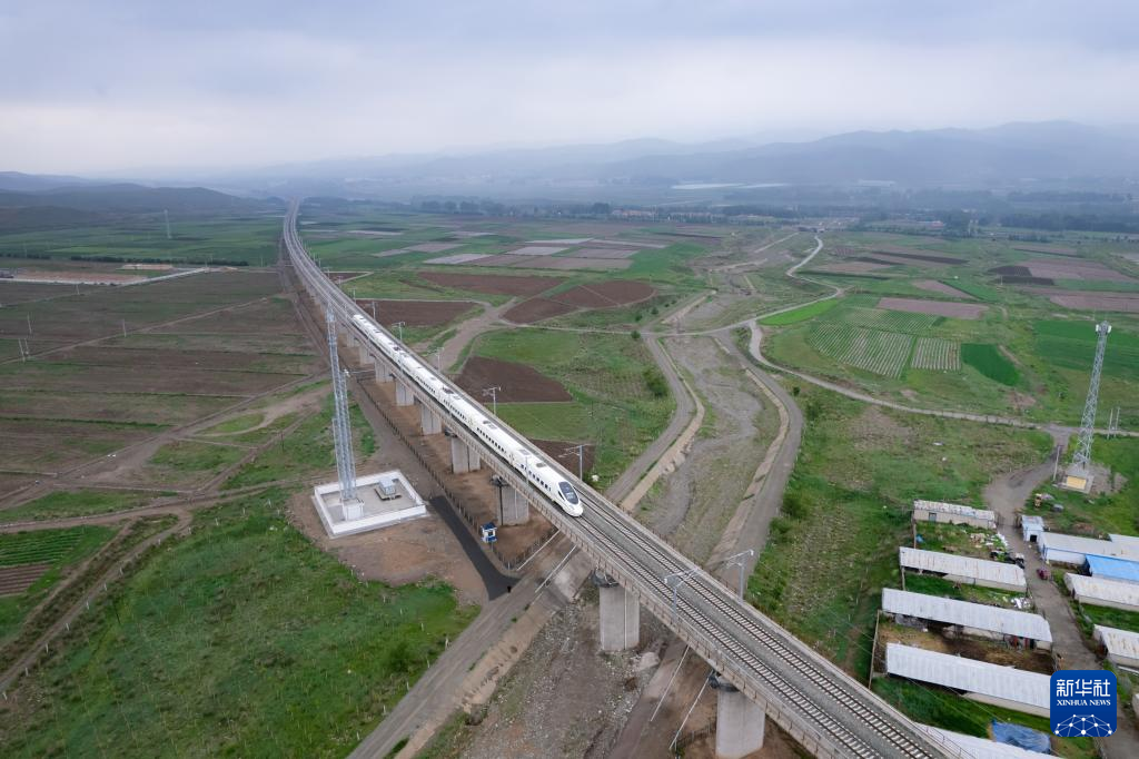 7月8日,列车行驶在乌鞘岭下的兰张高铁兰武段上(无人机照片)。新华社记者 郎兵兵 摄