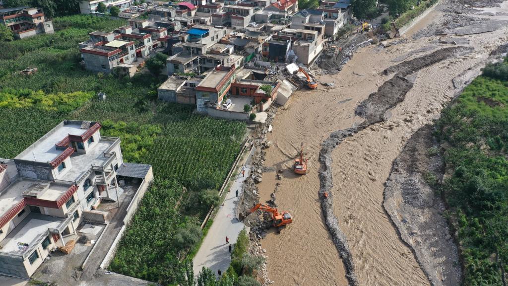 7月25日,在甘肃省陇南市武都区三河镇竹林村,救援人员抢修水毁路段(无人机照片)。新华社记者 郎兵兵 摄