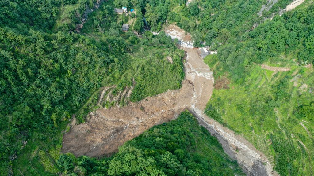 这是7月26日拍摄的武都区三河镇姚沟村三社山体滑坡现场(无人机照片)。新华社记者 郎兵兵 摄