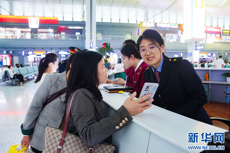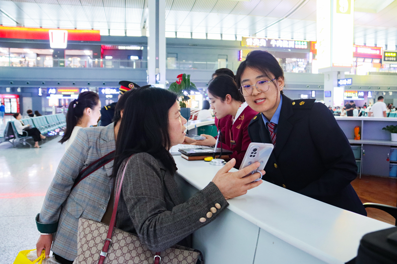 8月1日,兰州西站工作人员为乘车旅客解疑答惑。