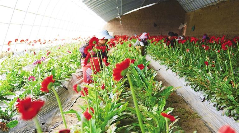 在夏官营镇孙家营村,鲜花基地负责人金花忙碌地穿梭在各个大棚里,除草、修枝、剪花、包装。
