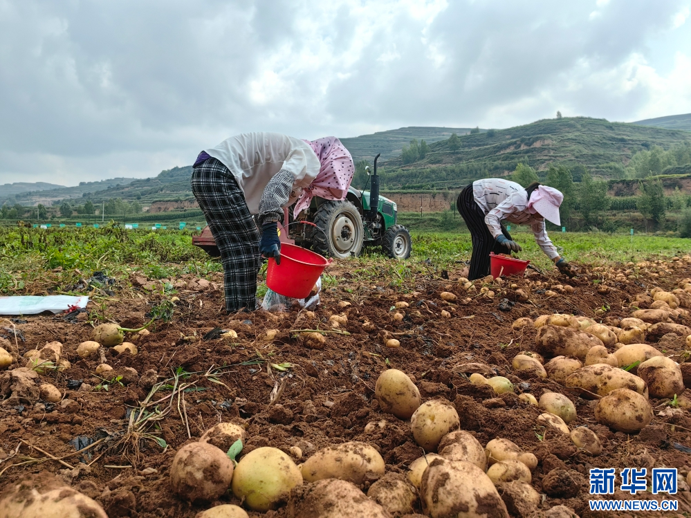 农户正在庄浪县的一处机耕地里收获马铃薯