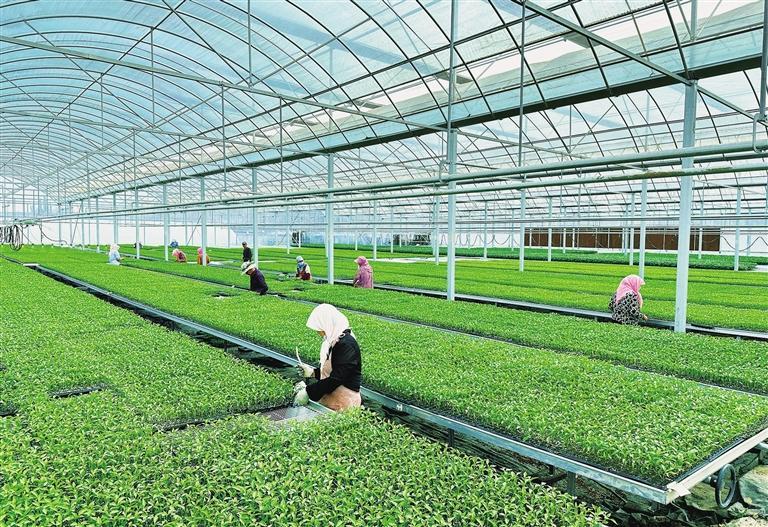 凉州区发放镇雨康种苗公司工人培育辣椒苗。