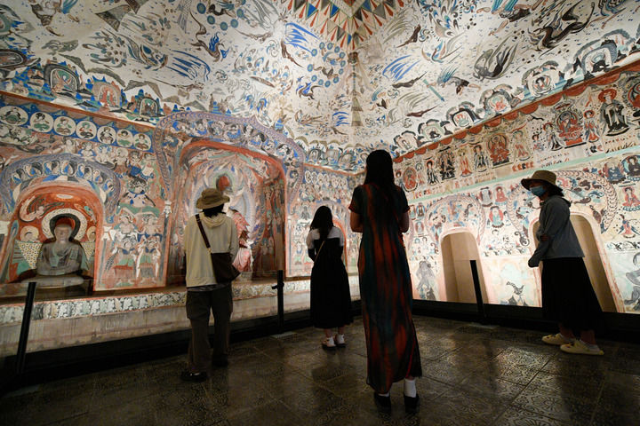 2024年6月7日,在敦煌石窟文物保护研究陈列中心,游客参观莫高窟复制洞窟第285窟壁画。新华社记者 郎兵兵 摄
