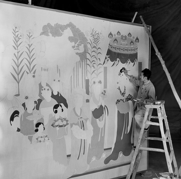 1944年,国立敦煌艺术研究所在大漠中成立。那时,莫高窟已荒废近400年。流沙从崖壁顶部倾泻而下,上百个洞窟被掩埋。壁画大块跌落,砸烂在地上。